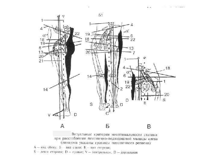 Патобиомеханические изменения статического стереотипа Неоптимальная статика - неравномерное гравитационное отягощение регионов позвоночника и конечностей, сопровождаемое формированием «остановленного падения» тела пациента в вертикальном положении и требующее для поддержания вертикального положения повышенной энергетической затраты мышечного сокращения. При этом одни регионы по воночника и з конечностей «вызывают падение тела пациента» , а другие его «останавливают» . Визуальные критерии: смещение проекции общего центра тяжести за пределы опоры ног. Региональный постуральный дисбаланс мышц - нарушение функциональных тонусно силовых взаимоотношений между укороченными и расслаблен ыми мышцами одного и того же региона н позвоночника или конечностей (Коган О. Г. с соавт. , 1998). Визуальные критерии: нарушение параллельности границ региона, смещение проекции регионaльного центра тяжести относительно середины нижней его границы. В зависимости от локализации раз ичают патогенетический и саногенетический варианты его формирования. л IIатогенетически значимый постуральный дисбаланс мышц региона - тонусно силовой дисбаланс мышц, «вызывающий» формирование «падения» тела пациента в статике. Визуальные критерии: «расхождение» границ региона и смещение проекции регионального центра тяжести в направлении смеще ия проекции общего центра тяжести. н
