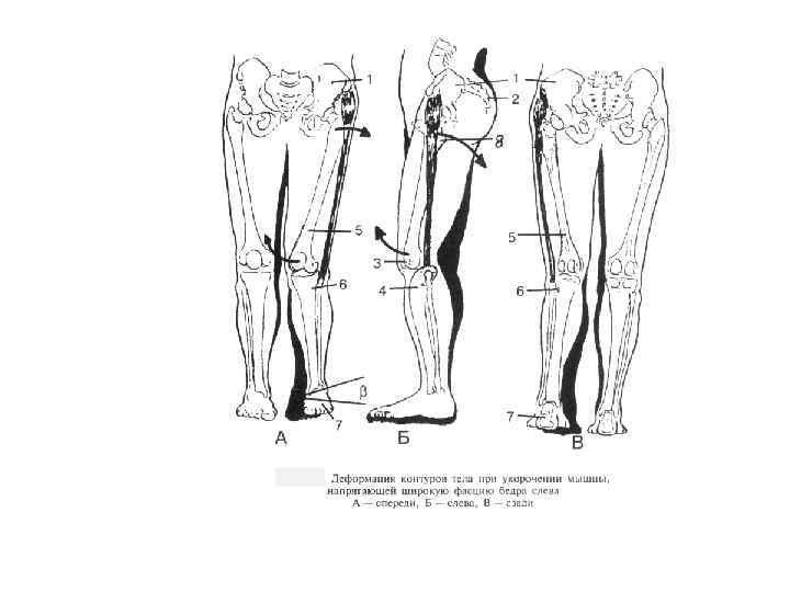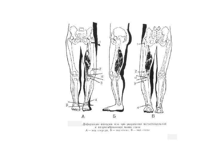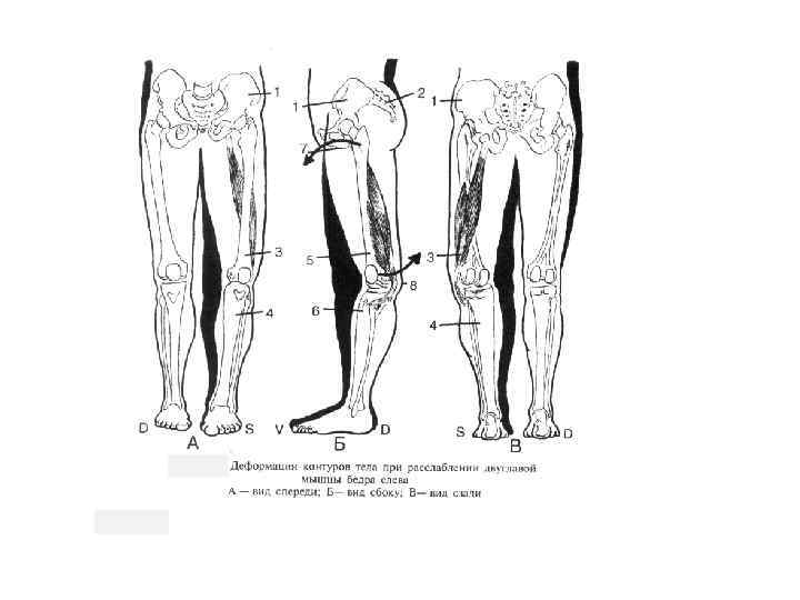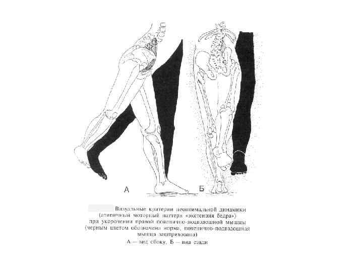 Скрученный таз мышечного генеза (первый вариант) При первом варианте скрученного таза мышечного генеза комбинация экстензии, аддукции, внутренней ротации формируется при укорочении всех мышц экстензоров бедра (полусухожильной, полумембранозной, двуглавой). Такой вариант наиболее часто возникает как компенсаторная реакция на биомеханическую несостоятельность большой ягодичной мышцы при формировании ее функциональной слабости. Снижение ее динамической активности, пo данным V. Janda (1978), способствует укорочению экстензоров бедра с одноименной стороны и квадратной мышцы поясницы с противоположной.
