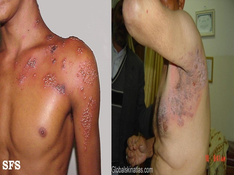 Высыпания возникают по ходу отдельных чувствительных нервов. Вначале появляются нечёткие розоватые пятна (диаметром 3-5 см), на фоне которых через 18-24 ч образуются группы болезненных везикул; Основной признак, отличающий их от прочих герпетических кожных поражений, - наличие чёткой демаркационной зоны. Наиболее часто поражения локализуются на грудной клетке, но также могут располагаться по ходу любого чувствительного нерва и, как правило, односторонне. Поражения исчезают в течение 2-4 недели, боль (невралгия) может сохраняться в течение недель и нескольких месяцев. Инкубационный период 10-20 дней (13-17). Недомогание и температура появляются раньше сыпи на несколько дней. Заразность: 1-2 суток до сыпи и до отпадения корок