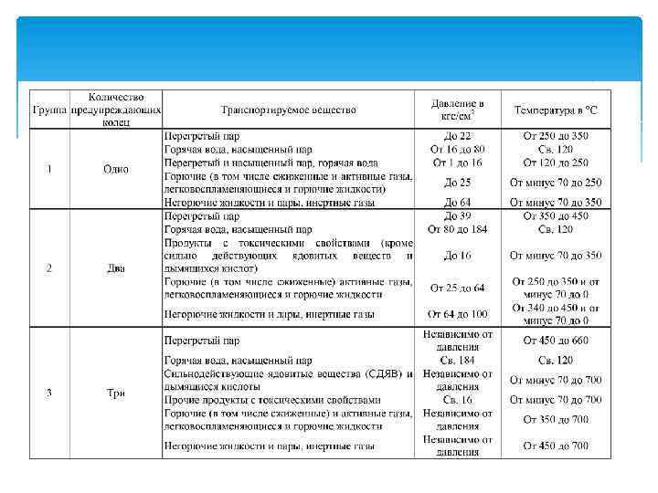 В случаях, когда вещество одновременно обладает несколькими опасными свойствами, обозначаемыми различными цветами, на трубопроводы одновременно следует наносить кольца нескольких цветов. На вакуумных трубопроводам, кроме отличительной окраски, необходимо давать надпись «вакуум» . По степени опасности для жизни и здоровья людей или эксплуатации предприятия вещества, транспортируемые по трубопроводам, должны подразделяться на три группы, обозначаемые соответствующим количеством предупреждающих колец в соответствии с таблице: