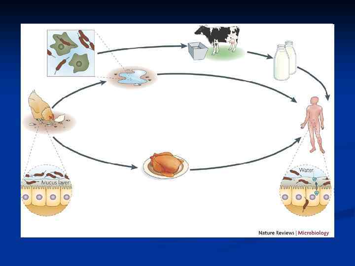 Эпидемиология Возбудители кампилобактериоза широко распространены в природе. Как комменсалы желудочно-кишечного тракта они присутствуют в кишечнике практически всех известных теплокровных животных и птиц, которые являются природным резервуаром кампилобактеров, а также в воде открытых водоемов, контаминированных фекалиями животных и птиц. Заболеваемость кампилобактериозом регистрируется повсеместно в виде спорадических случаев, эпидемических очагов с пищевым и водным путем передачи инфекции. В некоторых странах кампилобактеры являются ведущим этиологическим агентом острых кишечных инфекций, опережая сальмонеллезы и шигеллезы. Эпидемиологически значимыми источниками кампилобактериоза в настоящее время являются птицы (цыплята), крупный рогатый скот и свиньи. Человек при определенных условиях (больной, реконвалесцент) может являться источником инфекции, особенно для лиц с иммунодефицитными состояниями и детей раннего возраста.