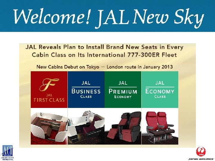 • • • Seat Name: Configuration: Seat pitch: Seat width: TV screen size: JAL SKY PREMIUM 2 -4 -2 (40 seats) Approx. 42 inch (107 cm)* Approx. 19 inch (48 cm)* 12. 1 inch Features • A substantial increase in seat pitch (distance between the seats) by as much as 4 inch (10 cm), providing more leg-space than ever before. • Increased seat-slide by up to approx. 2. 8 inch (7 cm) • 12. 1 inch personal touch-panel TV screens are 35% wider than previous Premium Economy product and one of the widest in its class. • Retained the fixed-back seat feature of its predecessor, providing the same undisturbed space even when a passenger seated in front reclines. • Center divider between seats at head-level to provide greater privacy. • Three-step adjustable footrest. *Specifications for front-row seats are different.