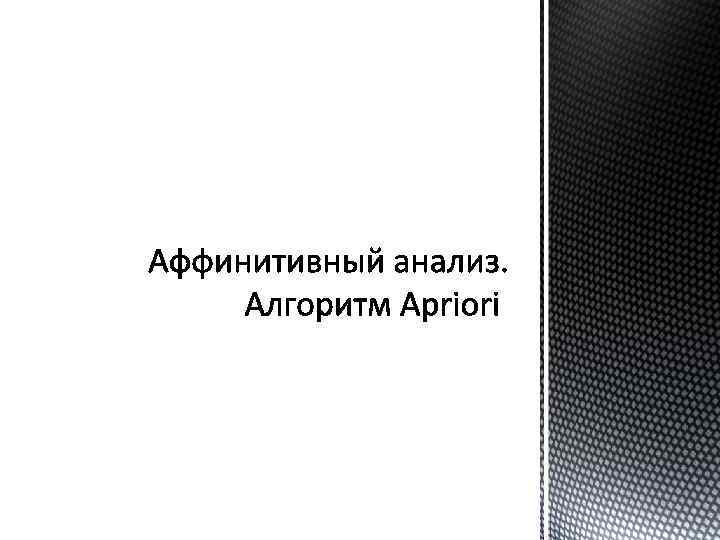 Определение Аффинитивный анализ (affinity analysis) — методы исследования взаимной связи (ассоциаций) между событиями происходящими совместно и их количественная (т. е. в виде числа) оценка. Результальт выполенния аффинитивного анализа – набор ассоциативных правил. «affinity» , в переводе означает «близость» , «сходство» .