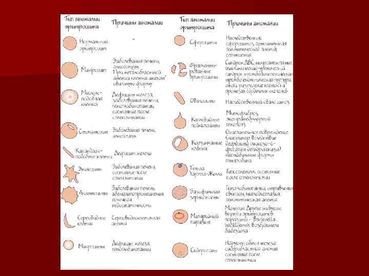 Морфология эритроцитов n n n Микроциты Microcyte Макроциты Macrocyte Шистоциты Schistocyte (helmet cell) Эхиноциты Burr cell Сфероцитоз Spherocyte Болезнь Минковского-Шофара Мишеневидные эритроциты Target cell Гемолитическая анемия - талассемия. Базофильная зернистость Basophilic stipping Nucleated red blood cell Миелопролиферативные и инфильтативные процессы (костный мозг). Каплевидные Tear drop Акантоцитоз Acanthocyte Абета-липо-протеинемия Элипсоцитоз Elliptocyte Овалоклеточная анемия