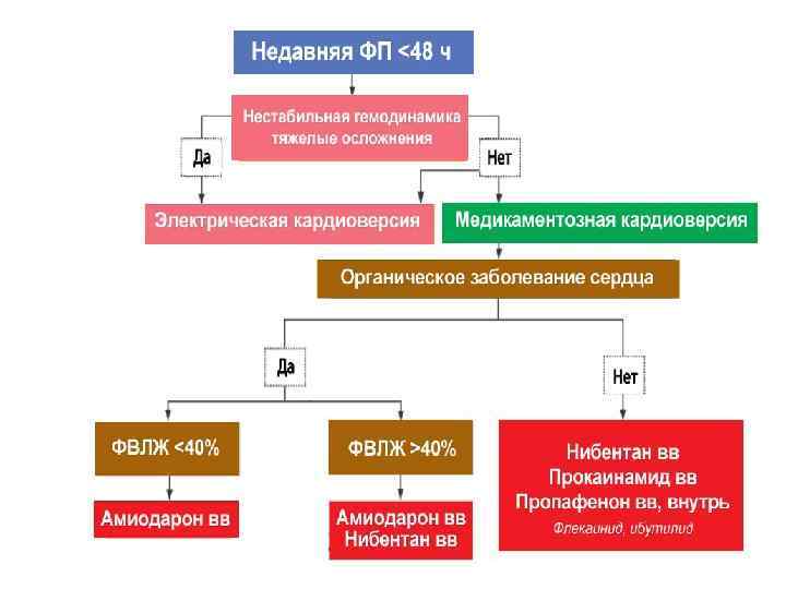 РЕКОМЕНДАЦИИ ПО ПРОВЕДЕНИЮ ФАРМАКОЛОГИЧЕСКОЙ КАРДИОВЕРСИИ ПРИ ФП МЕНЕЕ 7 СУТОК Препарат Способ введения Доза Перорально или в/в 200 – 300 мг 2 мг/кг в/в за 10 мин, 200 -400 мг в/в 1 мг в/в в течении 10 мин через 10 мин повторение дозы Пропафенон Перорально или в/в Амиодарон Перорально или в/в 450 – 600 мг 2 мг/кг в/в в течении 10 мин 5 мг/кг в/в в течении 1 ч далее 50 мг/ч Дофетилид Флекаинид Ибутилид Вернакалант в/в 3 мг/кг в/в за 10 мин, 2 мг/кг в/в за 10 мин через 15 мин.