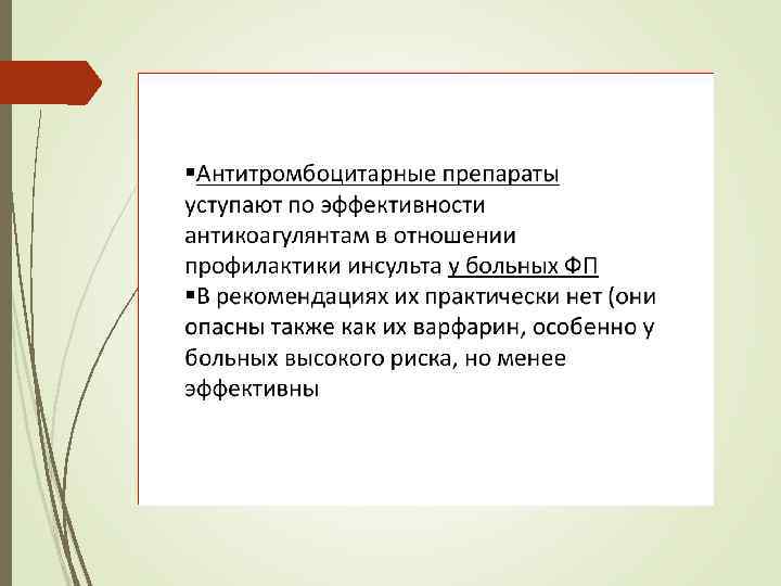 Тромбоэмболические осложнения при ФП v Неклапанная ФП увеличивает риск ишемического инсульта в 5 – 7 раз, а при митральном стенозе он возрастает в 12 – 14 раз. v Более 50% всех тромбоэмболий, источником которых является сердце, связано с неклапанной ФП. v Около 45% ишемических инсультов при ФП являются фатальными или сопровождаются тяжелыми неврологическими нарушениями. v Низкий риск инсультов ( 1% в год ) у больных моложе 60 лет с идиопатической ФП.