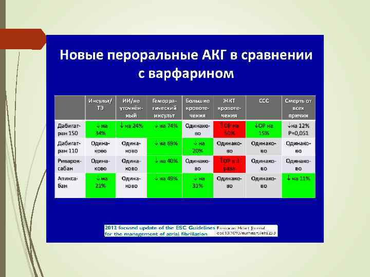 Ограничения терапии АВК Взаимодействия со многими пищевыми продуктами Непредсказуемый ответ Терапия АВК имеет ряд ограничений, что затрудняет их применение в клинической практике Узкое терапевтическое окно (диапазон МНО 2 -3) Резистентность к варфарину Медленное развитие/ окончание эффекта Постоянный контроль Антикоагулянтного эффекта Взаимодействия со многими лекарственными препаратами Необходимость в частой коррекции дозы МНО = международное нормализованное отношение; АВК = антагонист витамина К. Ansell J, et al. Chest 2008; 133; 160 S-198 S. Umer Ushman MH, et al. J Interv Card Electrophysiol 2008; 22: 129 -137. Nutescu EA, et al. Cardiol Clin 2008; 26: 169 -187.
