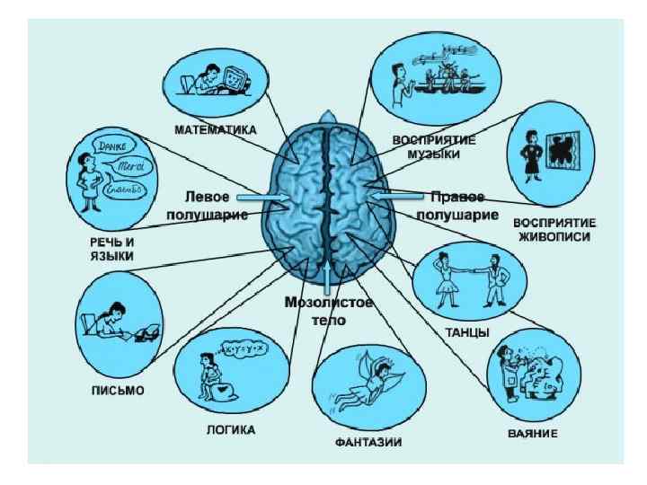 Функции левого и правого полушарии в ряде случаев симметричны: левое отвечает за движения правых конечностей и за чувствительность правой половины тела, а правое – за движение левых конечностей и все виды чувствительности с лева. Однако высшие психические функции соотносятся с правым и левым полушарием по-разному. Поэтому говорят о специализации полушарий. Всем известно, что два полушария человеческого мозга работают по-разному: левое полушарие отвечает за логические и лингвистические стороны умственных операций, а правое полушарие - за их образность и эмоциональность.