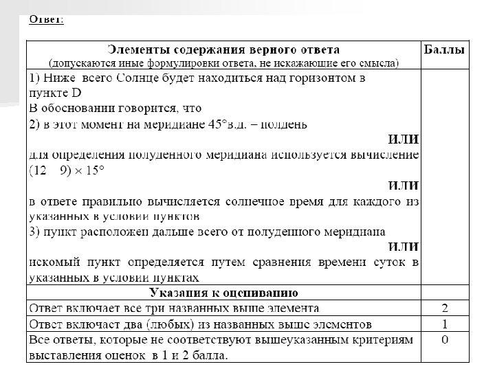 № Элемент задания Комментарий 1 Географические координаты Географическая широта Географические координаты — географическая широта и географическая долгота заданного объекта. Географическая широта — это расстояние какой-либо точки земной поверхности к северу или югу от экватора, выраженное в градусах. Широта бывает северной (если точка расположена к северу от экватора) и южной (если к югу от него). Географическая долгота — это расстояние какой-либо точки земной поверхности от начального меридиана, выраженная в градусах. К востоку от нулевого меридиана будет восточная долгота (сокращенно: в. д. ), к западу — западная (з. д. ). Полуденная высота Солнца над горизонтом над данной параллелью равна разности между высотой Солнца над параллелью, над которой оно стоит в зените, и разницей в широте между этими параллелями. 2 3 Географическая долгота 4 Соотнесение высоты солнца над горизонтом и Например: В день летнего солнцестояния Солнце в полдень находится в зените над географической северным тропиком (параллель 23, 5 о с. ш. ). В это время высота Солнца над широтой горизонтом например в Санкт-Петербурге в день летнего солнцестояния составит 90 о – (60 о – 23, 5 о)= 53, 5 о (широта Санкт-Петербурга - 60° с. ш. ) Соотнесение Выше всего Солнце над горизонтом находится в 12 часов дня. Зная время на Гринвичском высоты Солнца меридиане, можно определить, на какой долготе Солнце находится выше всего над горизонтом, т. е на какой долготе полдень. Каждые 15° по долготе время меняется на 1 и час. географической Например: На Гринвичском меридиане 11 часов. Значит, на меридиане 15°в. д. в это долготой время полдень. И здесь Солнце выше всего находится над горизонтом. Если по Гринвичскому меридиану 13 часов, то Солнце находится выше всего над горизонтом в 12 часов на долготе 15° з. д. 5