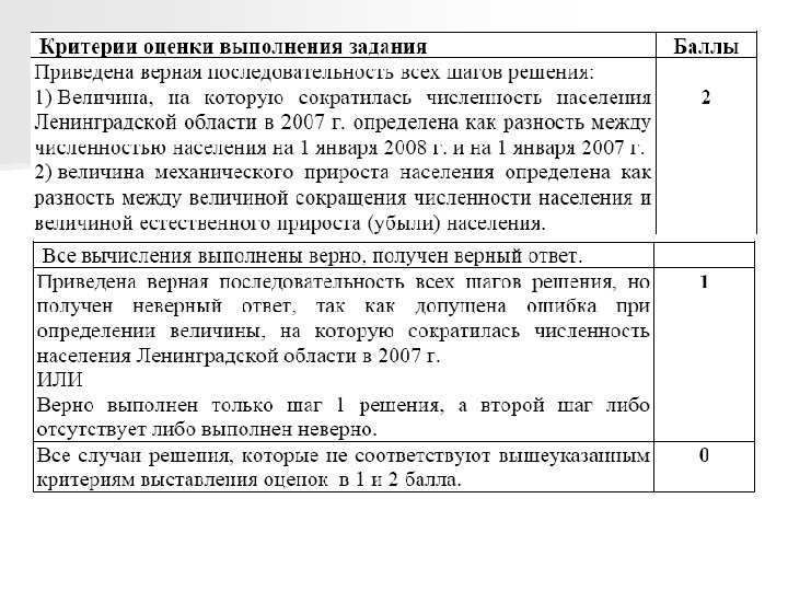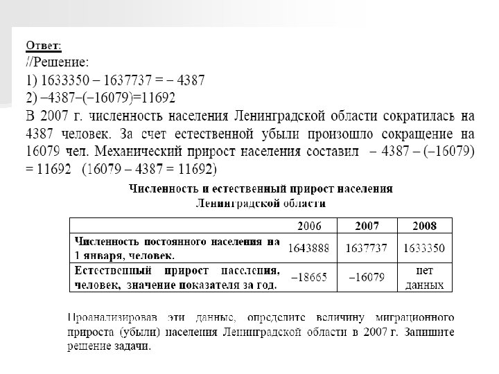 Население России. Демографическая ситуация КИМ-2010 впервые содержит задания, связанные с анализом статистических Решение: - 46816 : 6645672 х 1000 = -7 (округляют до В 9. Определите показатель естественного прироста населения в ‰ данных, характеризующих демографическую ситуацию субъектов Российской Федерации. Задания предполагают математические расчеты с целью определения в 2007 году для Московской области. целых чисел) качественных и количественных показателей. Полученный результат округлите до целого числа. Ответ: - 7 ‰. Примеры заданий Дана таблица: Численность и естественный прирост населения Московской области Год 2005 Численность 6629703 постоянного населения на 1 января, человек. Естественный прирост -56278 населения, человек, значение показателя за год. 2006 6628107 2007 6645672 2008 6672773 -52426 - 46816 -
