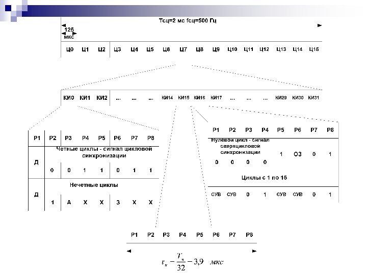 Сверхцикл ИКМ 30 содержит 16 циклов передачи и его продолжительность Тсц=Тц· 16=0, 125 мс· 16=2 мс, а частота следования сверхциклов и, следовательно, сигналов сверхцикловой синхронизации fсц=fд/16=500 Гц. Р 5 - « 1» , Р 7 - « 0» , Р 8 - « 1» , Р 6 используется для передачи сигнала о нарушении сверхцикловой синхронизации на противоположную станцию. Остальные символы – Р 3 - « 0» , Р 7 « 0» , Р 4 - « 1» , Р 8» 1» . В нечетных циклах Р 3 КИ 0 используется для передачи сигнала о нарушении цикловой синхронизации (А) Р 2 - « 1» , Р 6 – сигнал автоматического контроля остаточного затухания канала. Использование символов Р 4, Р 5, Р 7 и Р 8 в КИ 0 нечетных циклов не регламентируются и их занимают символами « 1» . Позиция Р 1 в КИ 0 и в четных и в нечетных циклах используется для передачи дискретной информации со скоростью 8 кбод.