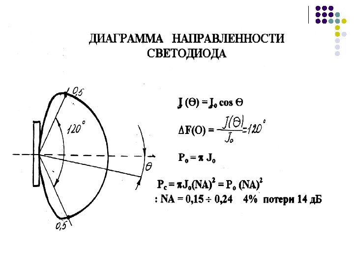 Согласующие устройства светодиод - волокно а) б) в) а) - использование специального иммерсионного наполнителя с коэффициентом преломления, близкий к коэффициенту преломления волокна; б) - конец волокна заострен и закруглен в форме линзы, собирающей расходящееся излучение; в) - сферическая линза, расположенная на поверхности светодиода