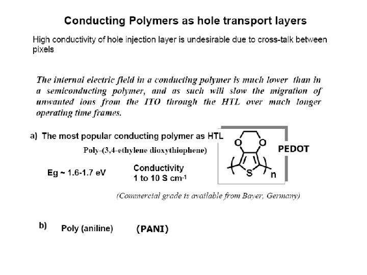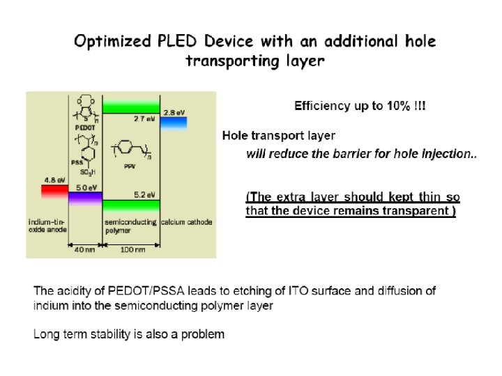 Недостатки органических полупроводников • Conductive polymers have high resistance and therefore are not good conductors of electricity. • Because of poor electronic behavior (lower mobility), they have much smaller bandwidths. • Shorter lifetimes and are much more dependant on stable environment conditions than inorganic electronics would be.