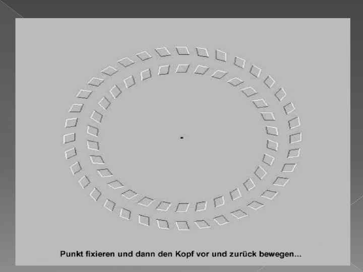 Це без сумніву найкраща комп’ютерна ілюзія. Попробуй обов’язково: 1) Розслабся і дивися невідриваючись 30 сек. на 4 маленькі точки в центрі. 2) Пізніше переведи повільно погляд на стінку ( або щось більше і одноколірне) біля себе. 3) Ти побачиш, як утворюється світлий круг. 4) Декілька разів блимни повіками і ти побачиш, як в цьому крузі утворюється фігура. 5) Що або кого ти бачив?