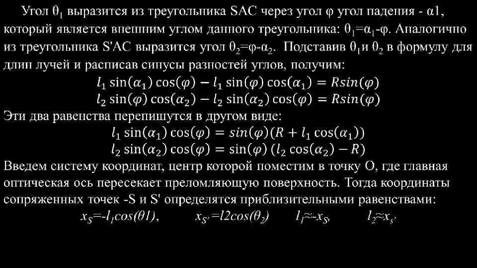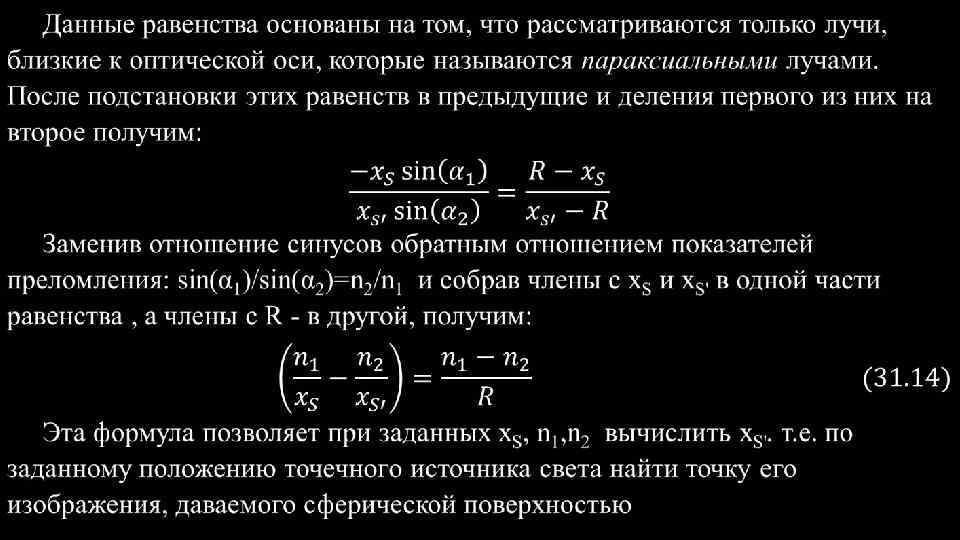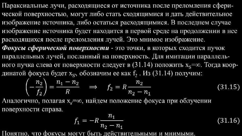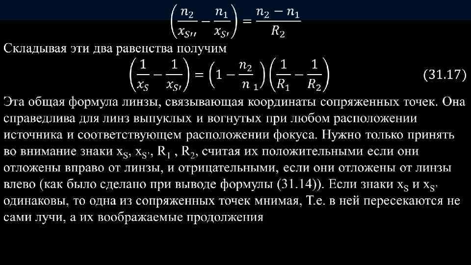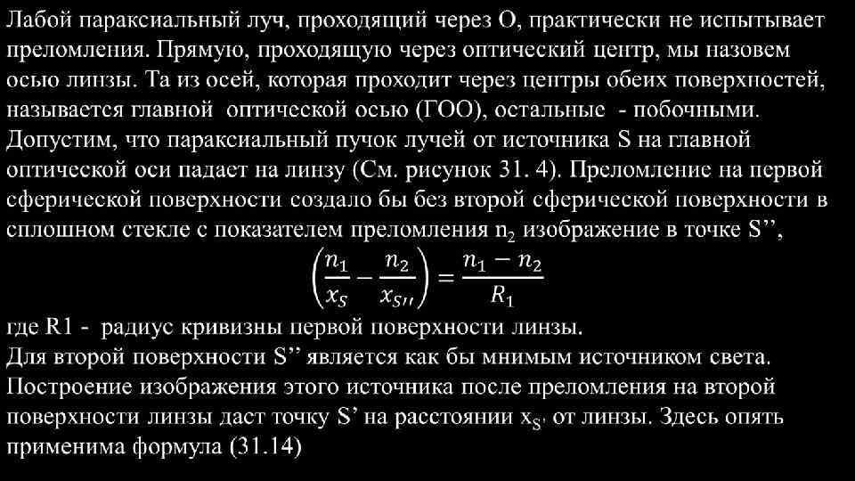 Центрированная оптическая система. - это набор преломляющих сферических поверхностей, центры которых лежат на одной прямой. Эта прямая называется главной осью системы. На рисунке показана система линз – двойных сферических поверхностей и главная оптическая ось. Простейший случай центрированной системы, состоящей всего из двух сферических поверхностей, ограничивающих какой-либо прозрачный хорошо преломляющий материал, (обычно стекло) от окружающего воздуха. Такая система представляет обычную линзу. Рис. 4 Рис. 31. 4 Линза называется тонкой, если обе ее вершины можно считать совпадающими, Т. е. если толщина линзы мала по сравнению с R 1 и R 2 , радиусами кривизны ограничивающих поверхностей. На рисунке для ясности линза изображена толстой. В дальнейших расчетах будем полагать, что точки О 1 и О 2 сливаются, и обозначим их буквой О. Все расстояния будем отсчитывать от этой точки О, которая носит название оптического центра линзы.