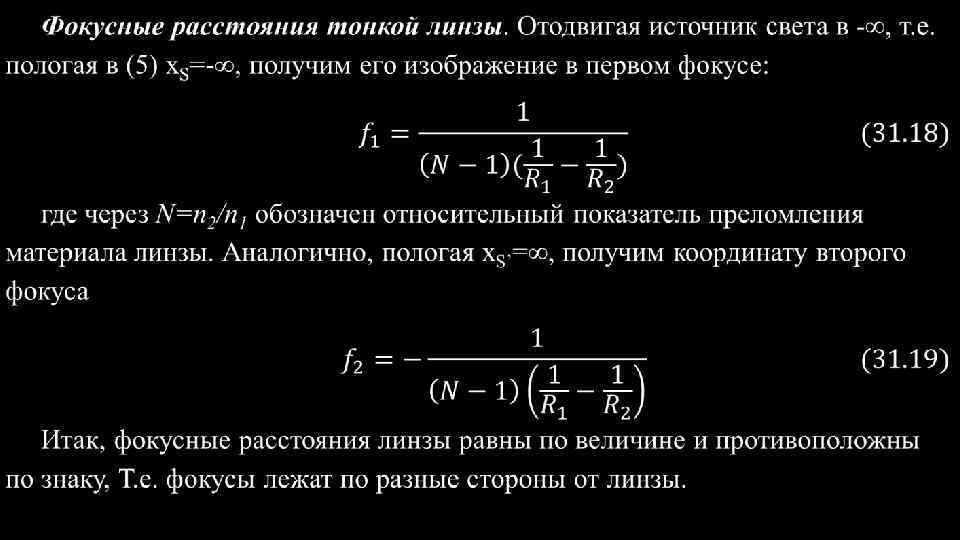В зависимости от знака и величины R 1 и R 2 , а также от знака (N-1), величина f 1 может быть положительной либо отрицательной, Т. е. фокус может быть мнимым или действительным. То же относится и к f 2, причем нетрудно видеть, что они оба либо мнимые, либо действительные. Если фокусы действительны, Т. е. параллельные лучи после преломления в линзе сходятся, то линза называется собирательной или положительной. При мнимых фокусах параллельные лучи после преломления в линзе становятся расходящимися. Поэтому такие линзы называются рассеивающими или отрицательными. Если материал тонкой линзы преломляет сильнее, чем окружающая среда (например, стеклянная линза в воздухе), то собирательными будут линзы, утолщающиеся к середине, К рассеивающим линзам принадлежит линзы, утончающиеся к середине.