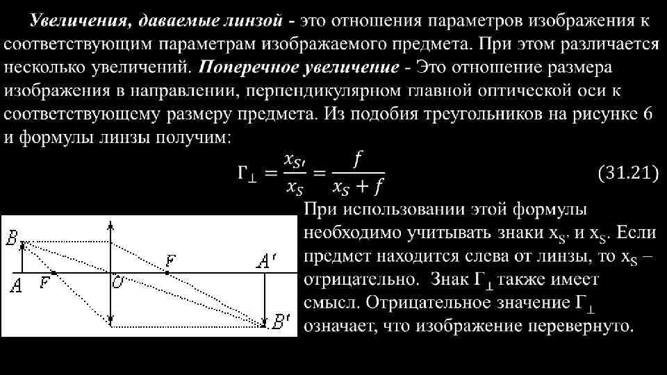 Один из них - луч, параллельный главной оптической Рис. 31. 5 оси, после линзы проходит через точку заднего фокуса F, другой луч BOB' , идущий вдоль побочной оптической оси, не преломляется линзой. Наконец третий луч из точки проходит через передний фокус и, преломляясь линзой пойдет за ней параллельно главной оптической оси. Построение этих лучей выполняется без затруднений, а точка пересечения их определит точку B', сопряженную с точкой В. В данном случае получается действительное перевернутое увеличенное изображение предмета. На рисунке 6 показано построение изображения, даваемого отрицательной линзой. В этом случае луч, испущенный точкой В параллельно главной оптической оси, отклоняется линзой вверх. Его мысленное продолжение в обратную сторону проходит через передний фокус. Точка пересечения этого продолжения с лучом вдоль побочной оптической оси даст изображение точки В. В этом случае изображение Рис. 31. 6 оказалось мнимым, неперевернутым, уменьшенным.