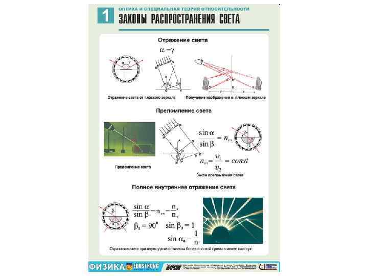 Закон прямолинейного распространения света Закон независимого распространения лучей Закон отражения света Закон преломления света Закон обратимости светового луча. 1. Закон прямолинейного распространения света и следствия из него: в однородной среде свет распространяется прямолинейно; световой луч представляет собой прямую линию; образование геометрической тени; при малых отверстиях наблюдаются отклонения от этого закона вследствие явления дифракции