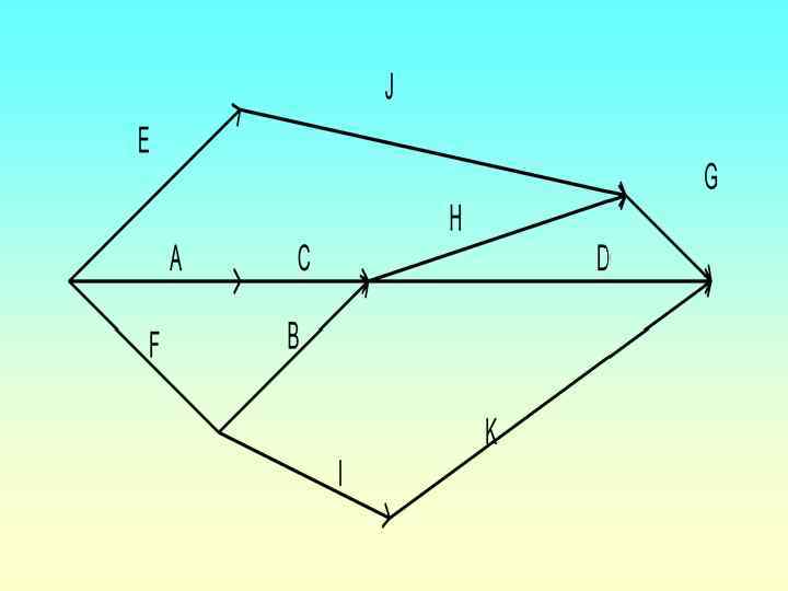 Завдання: Оптимізувати мережеву модель за критерієм «min виконавців» 1. A, E, F-вихідні роботи проекту, які можна починати одночасно; 2. Роботи B та I починають відразу по закінченню роботи F; 3. Робота J слідує за E, а робота C- за A; 4. Робота H та D слідує за B, але не можуть починатися поки не закінчена C; 5. Робота K слідує за I; 6. Робота G починається після закінчення H та J.