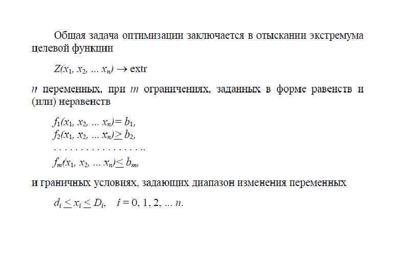 Градиентные методы Метод покоординатного Метод скорейшего Метод с спуска постоянным шагом спуска 1. Исходное (нулевое) приближение x 10, x 20. 2. Z 0 = Z(x 10, x 20). 3. grad Z(x 10, x 20) 4. Определение 4. Шаг длиной λ в 4. Определение большей по модулю частной оптимальной длины шага направлении −grad производной ∂Z/∂xi → λопт, например, 0, x 0) → точка Z(x 1 2 изменение xi на λ до тех пор, параболической пока Z не начнет аппроксимацией → шаг (x 11, x 21) увеличиваться → изменение длиной λопт в направлении … другой координаты → точка −grad Z(x 10, x 20) → точка (x 11, x 21) …