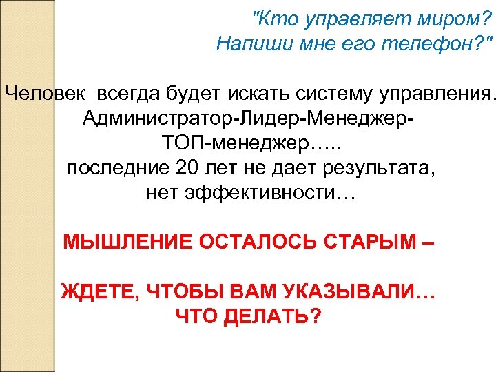 "Кто управляет миром? Напиши мне его телефон? " Человек всегда будет искать систему управления. Администратор-Лидер-Менеджер. ТОП-менеджер…. . последние 20 лет не дает результата, нет эффективности… МЫШЛЕНИЕ ОСТАЛОСЬ СТАРЫМ – ЖДЕТЕ, ЧТОБЫ ВАМ УКАЗЫВАЛИ… ЧТО ДЕЛАТЬ?
