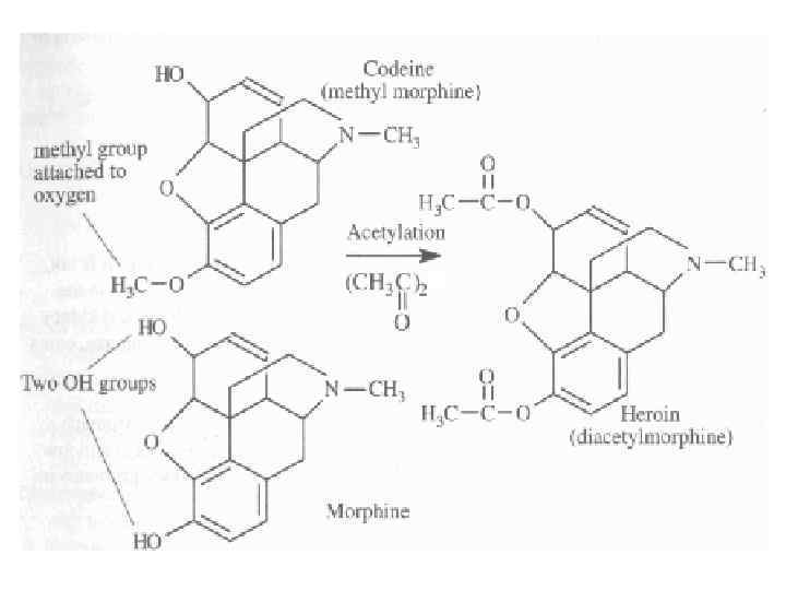 • Strong analgesics – Opium alkaloids (morphine, heroin, codeine) • Belong to “opiate” class (drug that exerts actions on the body similar to morphine) or “narcotics” (drug that produces a narcotic (sleep-inducing) effect as well as an analgesic (pain relieving) effect) – Morphine is principal alkaloid, making up about 10% by mass of raw opium – Codeine is about. 5% of raw opium – Heroin is synthesized from morphine (semisynthetic drug) via a simple acetylation
