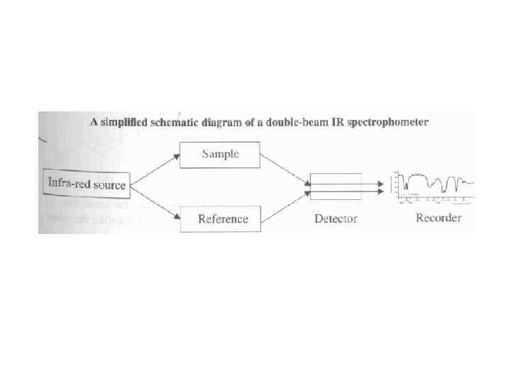 • Infra-Red Spectroscopy – IR light does not promote electrons to higher levels, but does provide enough energy to make molecules “vibrate” » Vibrational motion depends on the mass of the molecule and the types of bonds present – IR spectrum therefore depends on types of molecules present (“molecular fingerprint”) – Scale is based on wavenumber (1/wavelength) – Police use intoximeter (IR spectrometer) to confirm breathalyzer test » IR radiation is passed through breath sample » C-H group in alcohol absorbs a certain frequency of IR light » % transmittance of the C-H frequency is determined, indicating amount of alcohol present
