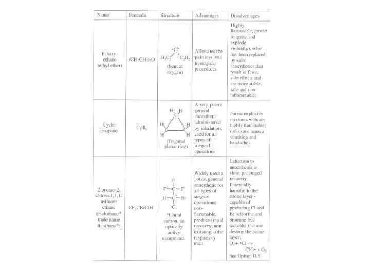 – General anaesthetics act on the brain and produce unconsciousness, which can be readily reversed • Nitrous oxide (N 2 O), diethyl ether (C 2 H 5 -O-C 2 H 5), chloroform (CHCl 3), cyclopropane (C 3 H 6), and halothane (CHCl. Br. CF 3) • Some disadvantages: – – Nitrous oxide is not very potent Trichloromethane (chloroform) can lead to liver damage Ethoxyethane and cyclopropane are highly flammable Halothane is harmful to the ozone layer