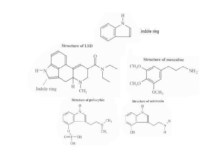 • LSD, mescaline, and psilocybin all contain a benzene ring (6 carbon); LSD and psilocybin contain an indole ring (6 carbon benzene ring fused to a 5 -membered ring containing a secondary nitrogen) • LSD is fat-soluble and easily diffuses into the brain • Psilocybin mimics the structure of the brain hormone serotonin