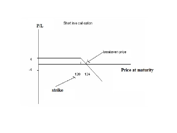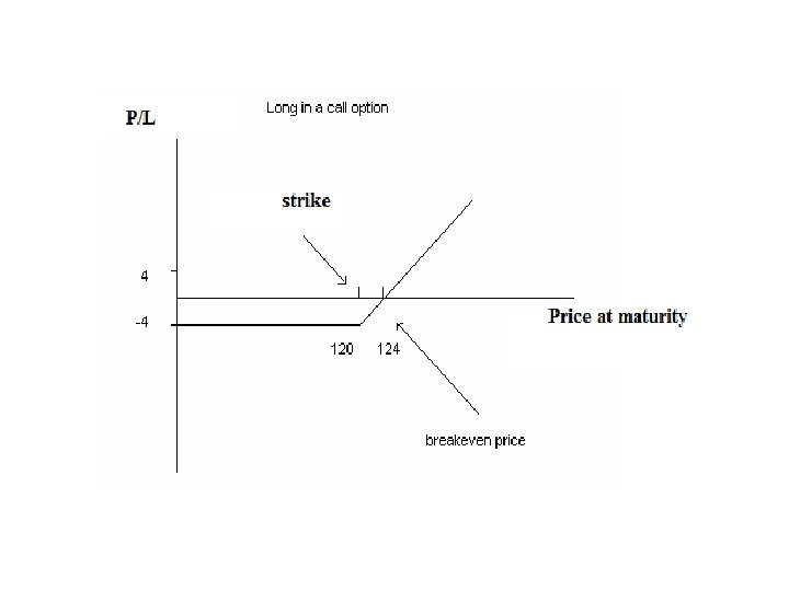 Example: Long in a call option • Assume that in 3 months the stock price is up by 3%, at about $121. 5. • Exercise? • If exercised we will pay $120 for a share that is now worth $121. 5 and gain $150. • Cost: $400 • Loss: $400 - $150 = $250 • 60% of our initial capital.