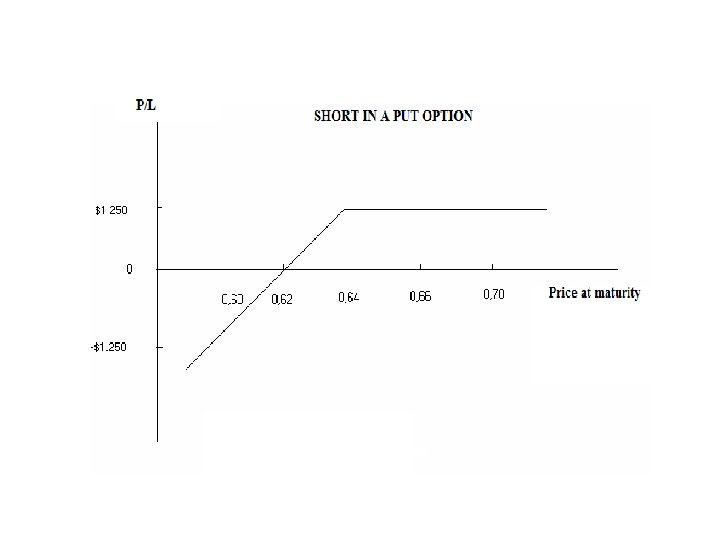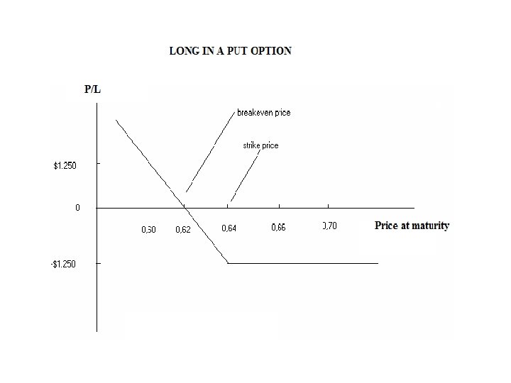 Example: Long in a put option • Assume that you buy a 2 -month European put option on currency Χ at a strike of $0. 64/Χ. Each contract is standardized at 62, 500Χ. • The premium is $0. 02 for each X. • Position: In two months we have the right but NOT the obligation • To Sell currency X • At an exchange rate of $0. 64/Χ • We pay for this right now $1. 250 ($0. 02 x 62. 500 Χ)