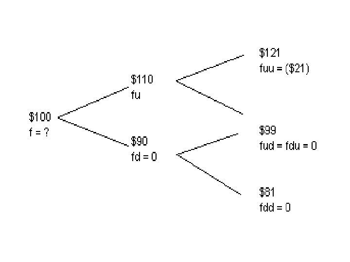 Repetitions show that: • fu = e-rΔT [ p fuu + (1 -p) fud ] • fd = e-rΔT [ p fud + (1 -p) fdd ] • f = e-rΔT [ p fu + (1 -p) fd ] • Replace the first two in the third: f = e-2 rΔT [ p 2 fuu + 2 p(1 -p)fud + (1 -p)2 fdd ]
