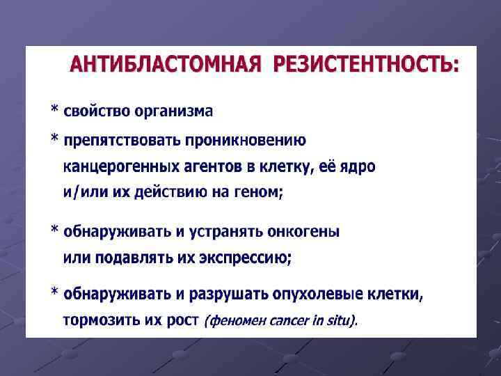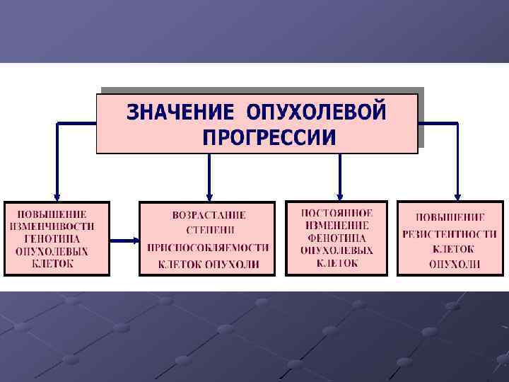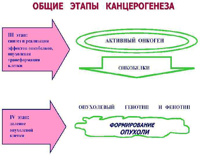 СТАДИИ РАЗВИТИЯ ОПУХОЛИ Инициация - заключается в мутации одного из генов, регулирующих клеточное размножение. Инициирующими факторами являются различные канцерогены, вызывающие повреждение ДНК Промоция - заключается в экспрессии онкогена и неограниченной пролиферации клетки, ставшей генотипически и фенотипически опухолевой. Процесс промоции индуцируют различные канцерогенные агенты, а также клеточные факторы роста. Прогрессия – заключается в появление в результате естественного отбора новых клонов опухолевых клеток, отличающихся гено- и фенотипически, обладающих быстрым ростом и устойчивостью к факторам защиты организма.