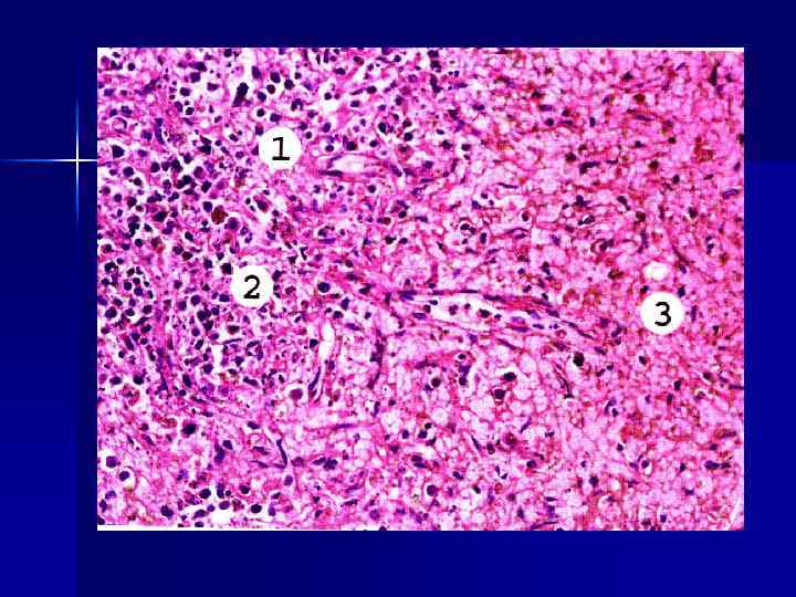 Микроскопически злокачественная олигодендроглиома состоит из полиморфных, плотно расположенных клеток, с большим числом митозов.