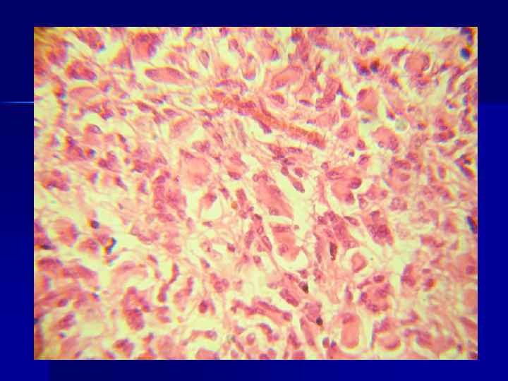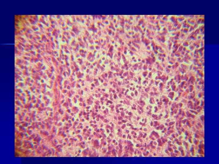 Микроскопически опухоль представлена низкодифференцированными мелкими округлыми или веретенообразными клетками с гиперхромным ядром, образующими «псевдопалисады» – очажки некроза, окруженные валом радиарно расположенных опухолевых клеток.
