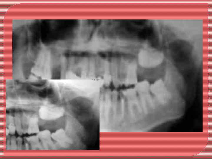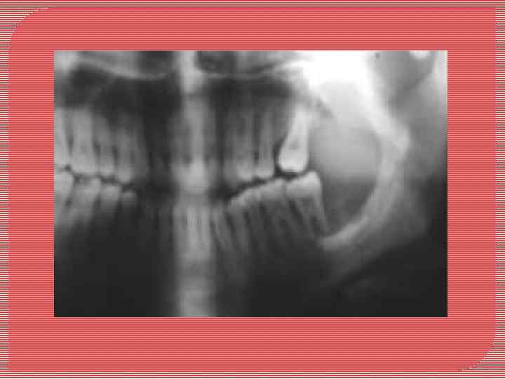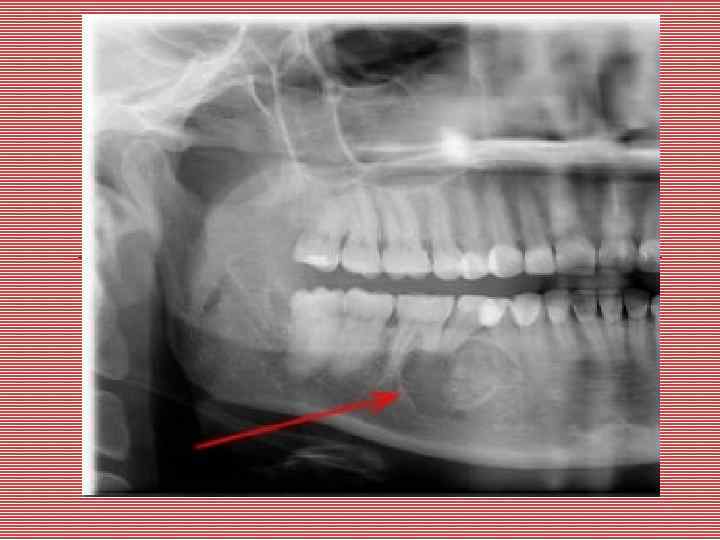 Панорамный рентгеновский снимок, показывающий большим и хорошо , отграниченное повреждение, вовлекающее нижней челюсти, от второго коренного зуба к первому премоляру. ___