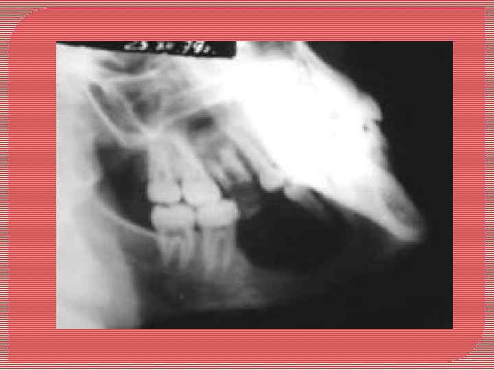 Амелобластома нижней челюсти (многокамерный вариант) Деструкция тела и ветви Между участками деструкции кости (полостями) четко выявляются перегородки (рентгенограмма).