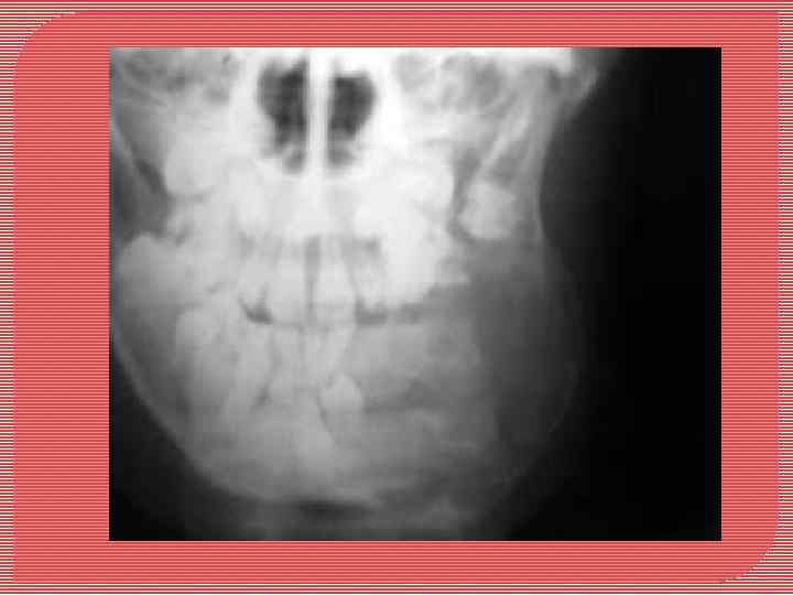 Основным рентгенологическим признаком является пестрота картины. Участки хаотического обызвествления чередуются с участками хрящевой ткани, которая представляется на рентгенограммах как "пустоты" с восковидным оттенком. Если остеобластическая функция выражена достаточно сильно, то возможно образование "спикул" (костные иглы, расположенные перпендикулярно к поверхности челюсти. )