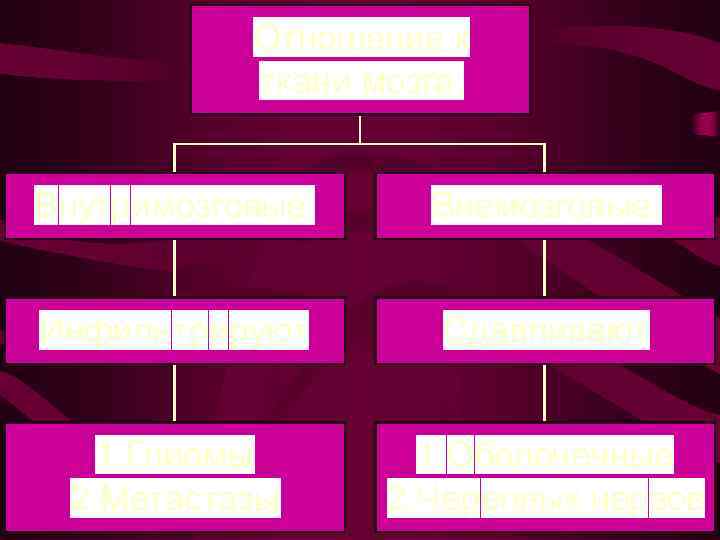 Гистологическая классификация опухолей. 1. Нейроэпителиальные опухоли. 2. Оболочечные опухоли. 3. Опухоли гипофиза. 4. Опухоли черепных нервов. 5. Сосудистые опухоли. 6. Дизэмбриогенентические. 7. Метастатические опухоли.