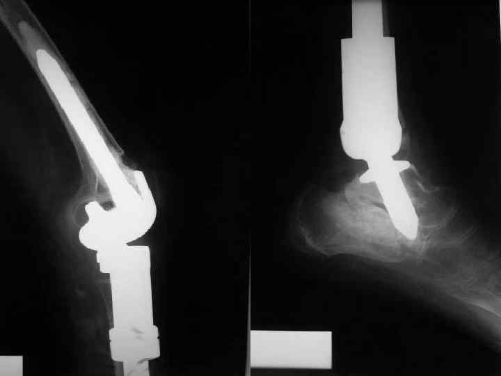 Рентгенограммы нижней конечности после удаления опухоли и эндопротезирования. Большеберцовая кость и два сустава – коленный и голеностопный замещены индивидуальным удлиняющимся эндопротезом.