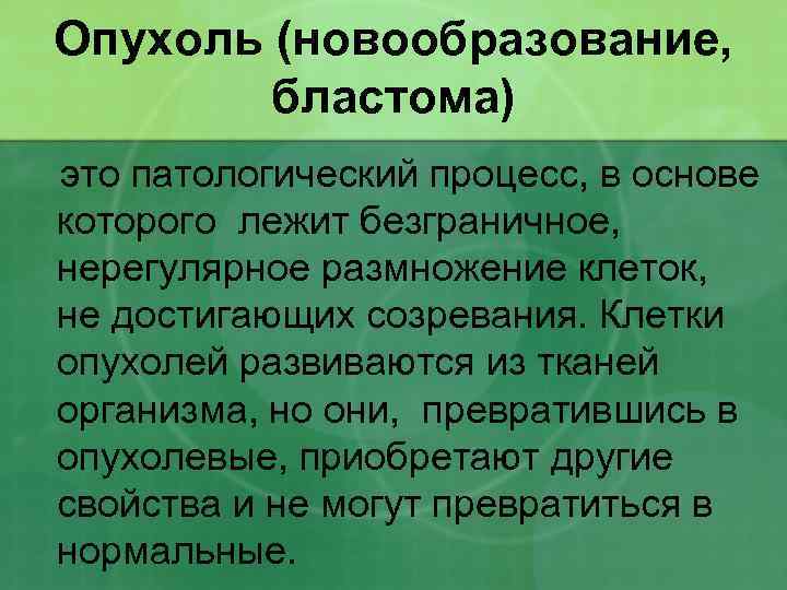 Опухоль (новообразование, бластома) это патологический процесс, в основе которого лежит безграничное, нерегулярное размножение клеток, не достигающих созревания. Клетки опухолей развиваются из тканей организма, но они, превратившись в опухолевые, приобретают другие свойства и не могут превратиться в нормальные.