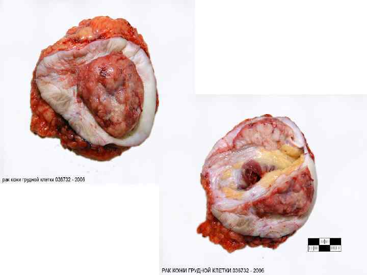 Рак кожи: опухоль представлена очагом уплотнения с изъязвлением и уплотненными валикообразными краями (а) или выступает в виде узла, также изъязвленного, на широком уплотненном основании, дно язвы неровное, «грязное» (б); а базально-клеточный рак, б плоскоклеточный рак (фотографии из архива А. В. Смольянниковой) Базально-клеточный рак кожи лица: опухолевые комплексы имеют вид тяжей или гнезд (тканевая атипия), расположенных в толще дермы под эпидермисом. Опухолевые клетки сходны с базальными клетками эпидермиса, округлой или овальной формы, с узким ободком базофильной цитоплазмы; умеренно выражен полиморфизм клеток и их ядер (клеточная атипия). Окраска гематоксилином и эозином: а - x 100, б - x 200