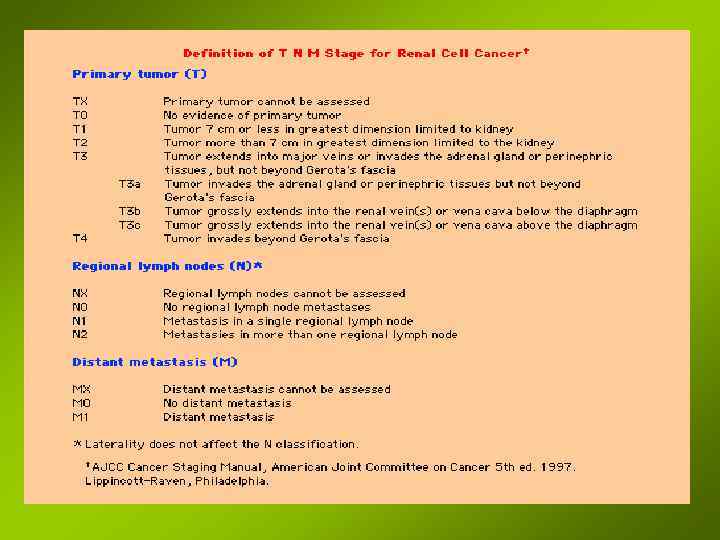 Консервативное лечение • Химиотерапия недостаточно эффективна – винкристин+блеомицин (курс 5 -6 мг/кг), – используются в лечении ЦФ, метотрексат, хлорамбуцил, винбластин. • Иммунотерапия (интерфероны , , ; роферон; интрон-А, интерлейкин-2). • Лучевая терапия: – как предоперационная подготовка; – как метод послеоперационного лечения метастазов. Симптоматическое лечение: – – – перидуральная денервация - 96% спирт. При лихорадке - ГКС 20 мг/сут на 4 приема; при тотальной гематурии - эмболизаия почечной артерии.