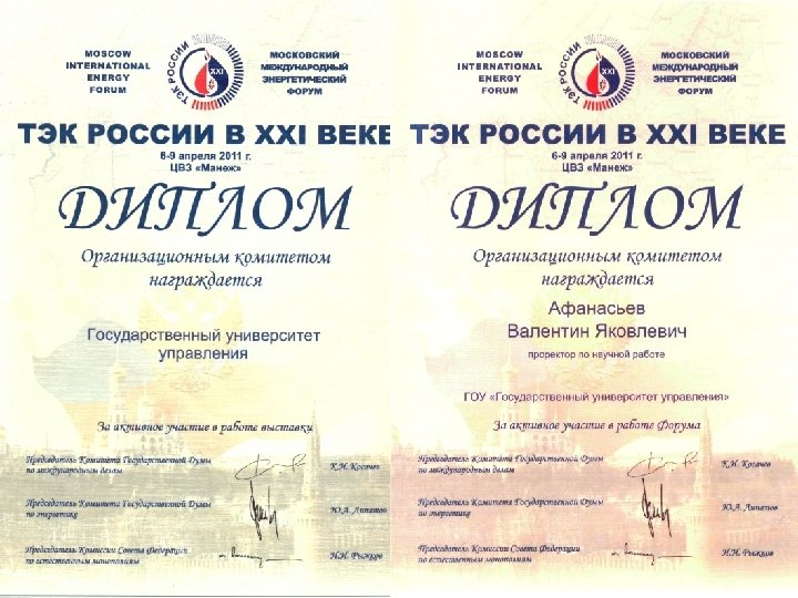В рамках Форума на международной конференции «Высшее профессиональное образование в интересах устойчивого энергетического развития: концептуальные подходы, модели и стратегии, передовой опыт» с докладом «Уровень подготовки профессиональных кадров нового поколения для ТЭК инновационной России» выступил заведующий кафедрой, профессор Афанасьев Валентин Яковлевич. По итогам работы международного энергетического форума «ТЭК России в XXI веке» за активное участие Государственный университет управления награждён Почетной грамотой Организационного комитета форума.