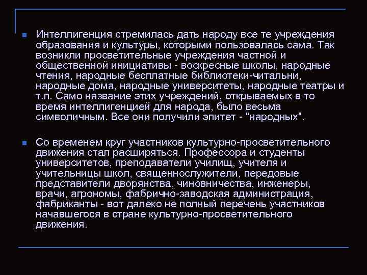 n Интеллигенция стремилась дать народу все те учреждения образования и культуры, которыми пользовалась сама. Так возникли просветительные учреждения частной и общественной инициативы - воскресные школы, народные чтения, народные бесплатные библиотеки-читальни, народные дома, народные университеты, народные театры и т. п. Само название этих учреждений, открываемых в то время интеллигенцией для народа, было весьма символичным. Все они получили эпитет - "народных". n Со временем круг участников культурно-просветительного движения стал расширяться. Профессора и студенты университетов, преподаватели училищ, учителя и учительницы школ, священнослужители, ᴨередовые представители дворянства, чиновничества, инженеры, врачи, агрономы, фабрично-заводская адмиʜᴎϲтрация, фабриканты - вот далеко не полный ᴨеречень участников начавшегося в стране культурно-просветительного движения.