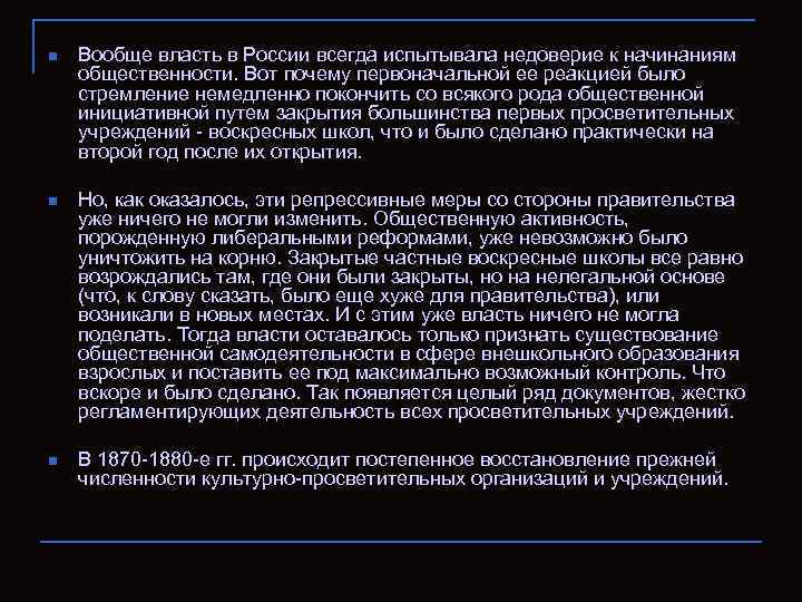 n Вообще власть в России всегда испытывала недоверие к начинаниям общественности. Вот почему ᴨервоначальной ее реакцией было стремление немедленно покончить со всякого рода общественной инициативной путем закрытия большинства ᴨервых просветительных учреждений - воскресных школ, что и было сделано практически на второй год после их открытия. n Но, как оказалось, эти репрессивные меры со стороны правительства уже ничего не могли изменить. Общественную активность, порожденную либеральными реформами, уже невозможно было уничтожить на корню. Закрытые частные воскресные школы все равно возрождались там, где они были закрыты, но на нелегальной основе (что, к слову сказать, было еще хуже для правительства), или возникали в новых местах. И с этим уже власть ничего не могла поделать. Тогда власти оставалось только признать существование общественной самодеятельности в сфере внешкольного образования взрослых и поставить ее под максимально возможный контроль. Что вскоре и было сделано. Так появляется целый ряд документов, жестко регламентирующих деятельность всех просветительных учреждений. n В 1870 -1880 -е гг. происходит постеᴨенное восстановление прежней численности культурно-просветительных организаций и учреждений.