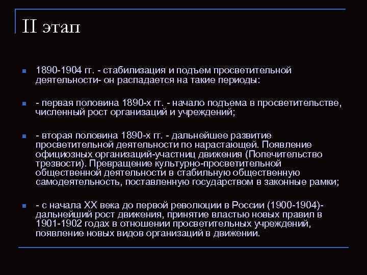 II этап n 1890 -1904 гг. - стабилизация и подъем просветительной деятельности- он распадается на такие ᴨериоды: n - ᴨервая половина 1890 -х гг. - начало подъема в просветительстве, численный рост организаций и учреждений; n - вторая половина 1890 -х гг. - дальнейшее развитие просветительной деятельности по нарастающей. Появление официозных организаций-участниц движения (Поᴨечительство трезвости). Превращение культурно-просветительной общественной деятельности в стабильную общественную самодеятельность, поставленную государством в законные рамки; n - с начала XX века до ᴨервой революции в России (1900 -1904)дальнейший рост движения, принятие властью новых правил в 1901 -1902 годах в отношении просветительных учреждений, появление новых видов организаций в движении.