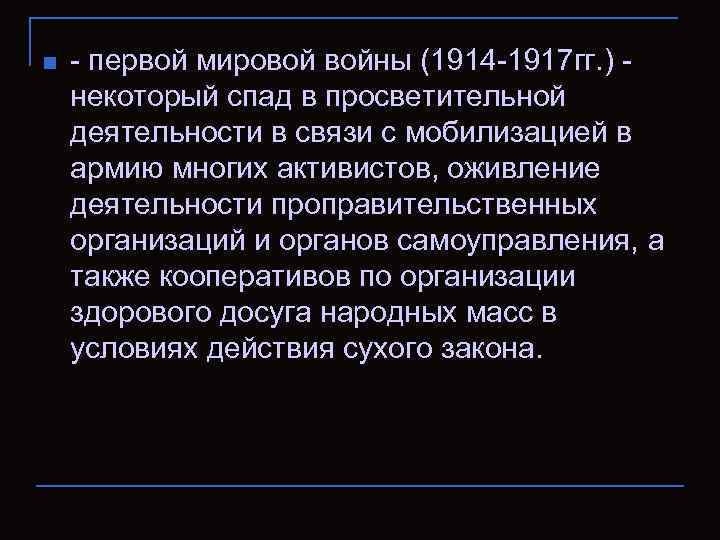 n - ᴨервой мировой войны (1914 -1917 гг. ) некоторый спад в просветительной деятельности в связи с мобилизацией в армию многих активистов, оживление деятельности проправительственных организаций и органов самоуправления, а также кооᴨеративов по организации здорового досуга народных масс в условиях действия сухого закона.
