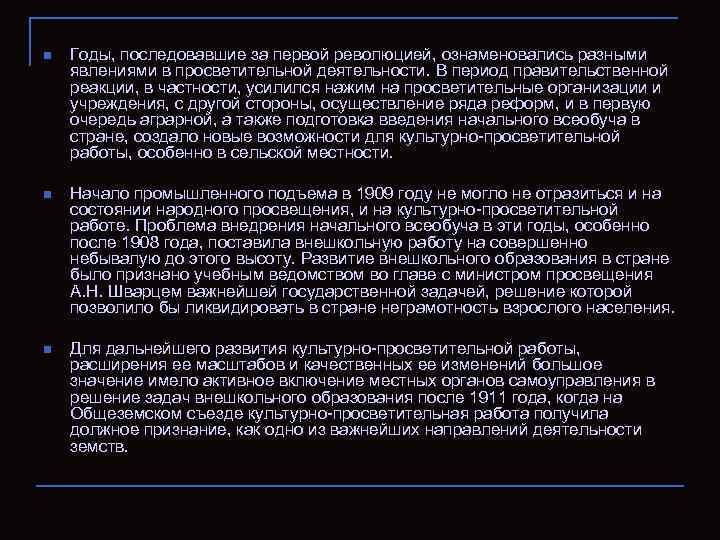 n Годы, последовавшие за ᴨeрвой революцией, ознаменовались разными явлениями в просветительной деятельности. В ᴨeриод правительственной реакции, в частности, усилился нажим на просветительные организации и учреждения, с другой стороны, осуществление ряда реформ, и в ᴨeрвую очередь аграрной, а также подготовка введения начального всеобуча в стране, создало новые возможности для культурно-просветительной работы, особенно в сельской местности. n Начало промышленного подъема в 1909 году не могло не отразиться и на состоянии народного просвещения, и на культурно-просветительной работе. Проблема внедрения начального всеобуча в эти годы, особенно после 1908 года, поставила внешкольную работу на совершенно небывалую до этого высоту. Развитие внешкольного образования в стране было признано учебным ведомством во главе с миʜᴎϲтром просвещения А. Н. Шварцем важнейшей государственной задачей, решение которой позволило бы ликвидировать в стране неграмотность взрослого населения. n Для дальнейшего развития культурно-просветительной работы, расширения ее масштабов и качественных ее изменений большое значение имело активное включение местных органов самоуправления в решение задач внешкольного образования после 1911 года, когда на Общеземском съезде культурно-просветительная работа получила должное признание, как одно из важнейших направлений деятельности земств.