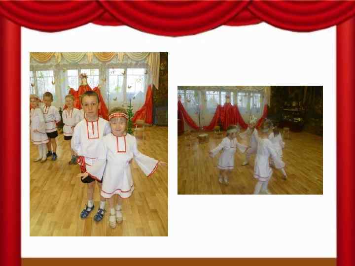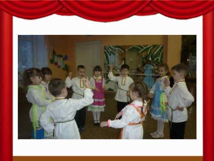 Задачи: -продолжать воспитывать у детей желание познавать культуру своего народа (через сказку, песни, танцы) -познакомить детей с марийским фольклором: используя марийские сказки, побуждать проявлять интерес к драматизации сказки под руководством взрослого; -учить детей петь выразительно, правильно передавая мелодию; исполнять танцевальные движения луговых мари, ритмично двигаться в соответствии с различным характером музыки; -развивать стремление самостоятельно исполнять марийские песни.
